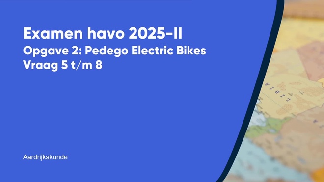 Op deze pagina behandelen we Opgave 2 - Pedego Electric Bikes van het aardrijkskunde havo eindexamen 2025 - tijdvak 2. Deze opgave bestaat uit 4 vragen (vraag 5 t/m 8) en wordt volledig uitgelegd door onze docent Robert, in een begeleidende video met uitleg per vraag.
