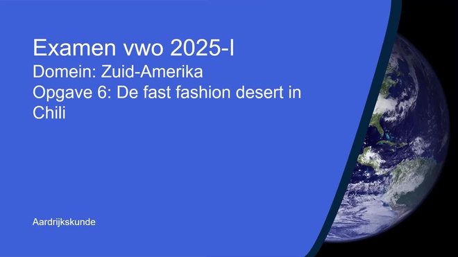 Op deze pagina behandelen we Opgave 6 - De fast fashion desert in Chili van het aardrijkskunde vwo eindexamen 2025 - tijdvak 1. Deze opgave bestaat uit 4 vragen (vraag 21 t/m 24) en wordt volledig uitgelegd door onze docent Robert, in een begeleidende video met uitleg per vraag.
