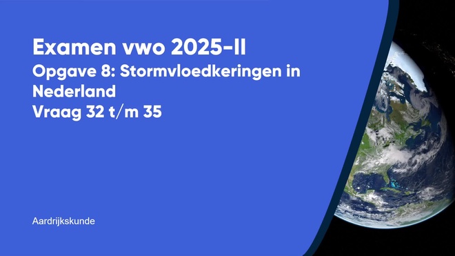 Op deze pagina behandelen we Opgave 8 - Stormvloedkeringen in Nederland van het aardrijkskunde vwo eindexamen 2025 - tijdvak 2. Deze opgave bestaat uit 4 vragen (vraag 32 t/m 35) en wordt volledig uitgelegd door onze docent Robert, in een begeleidende video met uitleg per vraag.