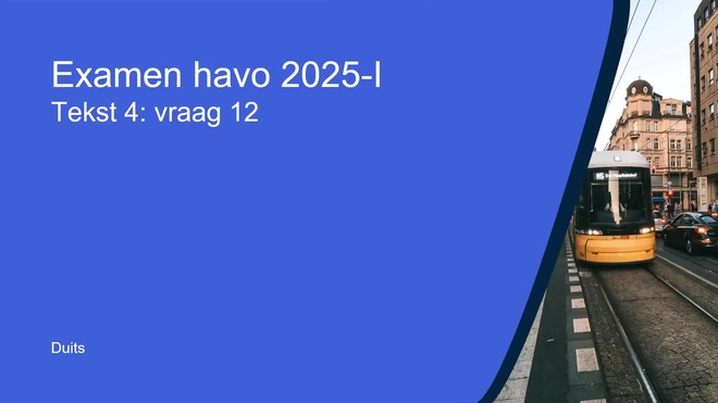 Op deze pagina behandelen we Tekst 4 van het duits havo eindexamen 2025 - tijdvak 1. Deze opgave bestaat uit een vraag (vraag 12) en wordt volledig uitgelegd door onze docent undefined, in een begeleidende video met uitleg per vraag.
