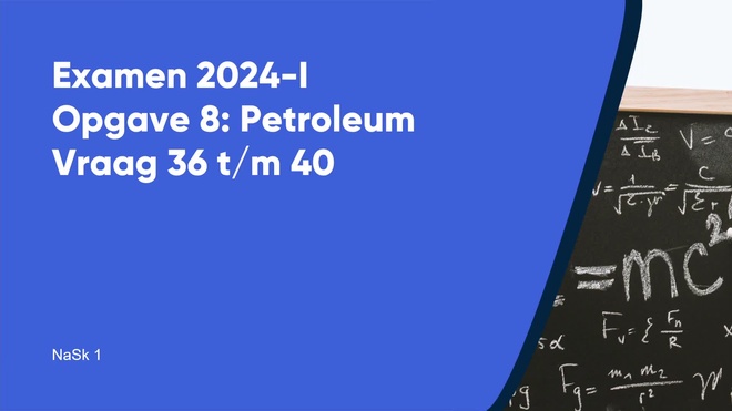 Op deze pagina behandelen we Petroleum van het nask1 vmbo eindexamen 2024 - tijdvak 1. Deze opgave bestaat uit 5 vragen (vraag 36 t/m 40) en wordt volledig uitgelegd door onze docent Lisanne, in een begeleidende video met uitleg per vraag.