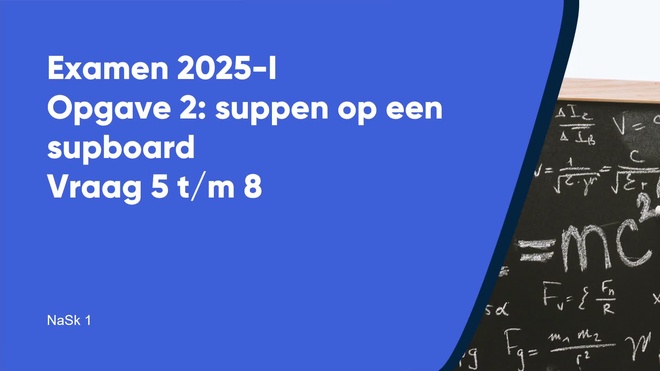 Op deze pagina behandelen we Suppen op een supboard van het nask1 vmbo eindexamen 2025 - tijdvak 1. Deze opgave bestaat uit 4 vragen (vraag 5 t/m 8) en wordt volledig uitgelegd door onze docent Lisanne, in een begeleidende video met uitleg per vraag.