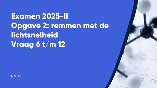 Op deze pagina behandelen we Remmen met de lichtsnelheid van het nask1 vmbo eindexamen 2025 - tijdvak 2. Deze opgave bestaat uit 7 vragen (vraag 6 t/m 12) en wordt volledig uitgelegd door onze docent Lisanne, in een begeleidende video met uitleg per vraag.