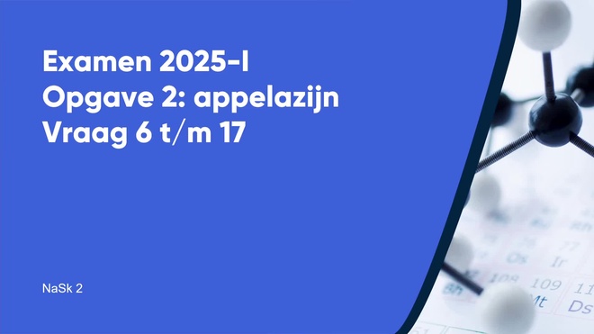 Op deze pagina behandelen we Appelazijn van het nask2 vmbo eindexamen 2025 - tijdvak 1. Deze opgave bestaat uit 12 vragen (vraag 6 t/m 17) en wordt volledig uitgelegd door onze docent Lisanne, in een begeleidende video met uitleg per vraag.