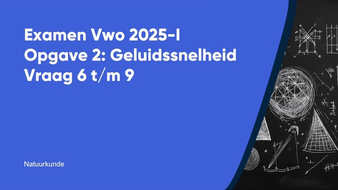 Op deze pagina behandelen we Geluidssnelheid van het natuurkunde vwo eindexamen 2025 - tijdvak 1. Deze opgave bestaat uit 4 vragen (vraag 6 t/m 9) en wordt volledig uitgelegd door onze docent Margriet, in een begeleidende video met uitleg per vraag.