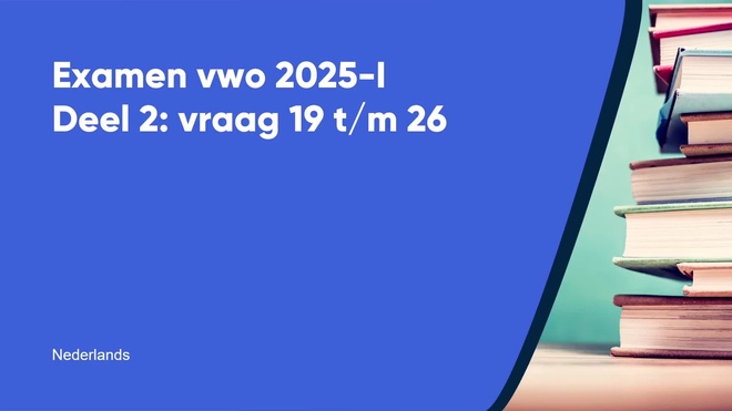 Op deze pagina behandelen we Deel 2 van het nederlands vwo eindexamen 2025 - tijdvak 1. Deze opgave bestaat uit 8 vragen (vraag 19 t/m 26) en wordt volledig uitgelegd door onze docent Andjana , in een begeleidende video met uitleg per vraag.